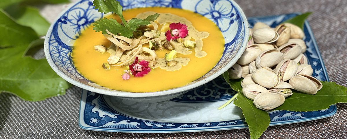 将黄油和食用油放入汤锅中,用中火加热。当黄油融化时,加入胡萝卜片和洋葱,翻炒约6-8分钟,直至洋葱变软。加入五香粉和盐,倒入鸡肉汤、水、姜泥和柠檬皮屑,将火关小,煮约15分钟,直至胡萝卜变软。将汤倒入搅拌器中,搅拌至顺滑,然后加入开心果拌匀。