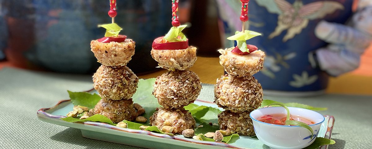 将虾蓉揉成小球(直径约1-1/4英寸/3厘米)。均匀地裹上裹粉,用中火加热的油中炸,时而翻转。当虾球开始浮起时,继续炸1-1/2分钟,不时翻动以均匀上色。取出炸篮,将虾球在纸巾上沥干多余油分。