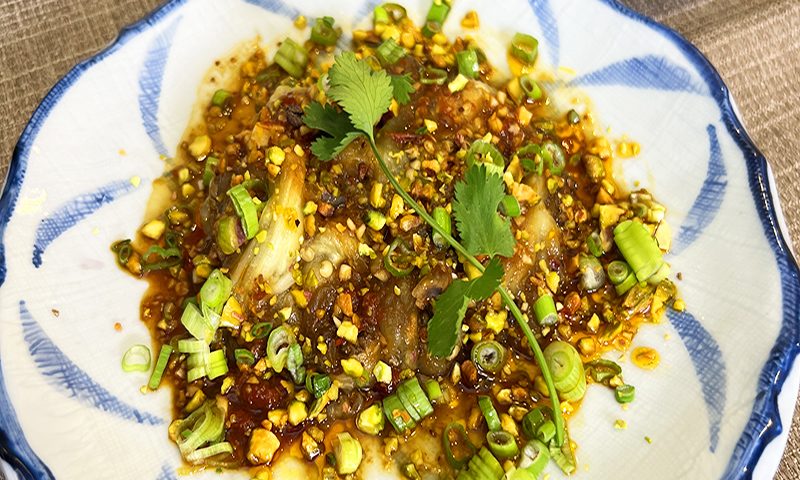 Fill a large deep pot with water and bring to a boil over high heat. Add garlic, ginger, green onions and salt. Add eggplants; cook, turning occasionally, until they are just cooked through and tender when pierced with the tip of a sharp knife, about 8 minutes, depending on thickness of eggplants. Drain, discarding green onions and ginger.